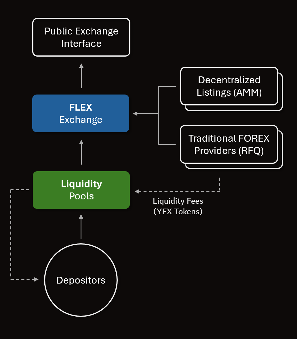 All trades are settled on-chain in real time using either AMMs or by borrowing from FLEX liquidity pools for off-chain quotes. Transaction and liquidity fees are paid in YFX tokens.